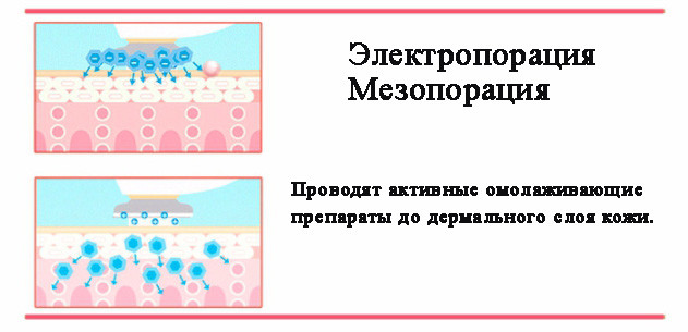В процесі безголкові мезотерапії (електропорації, мезопорации) в клітини шкіри доставляються корисні компоненти мезококтейль сироваток або гелів, які проводяться на глибокі шари шкіри під впливу коливань електричних струмів, через утворені ними канали. Використовувані з проблеми косметологічні засоби, при проникненні, сприяють розгладженню зморшок, поліпшення структури і кольору шкіри особи, повернення пружності. Особа набуває сяйво і здоровий відтінок.