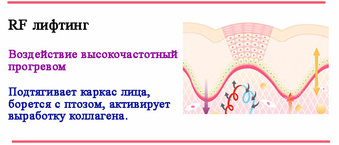 Процедура RF-ліфтинг, тобто радіохвильове вплив, призначена для омолодження шкіри. За допомогою радіохвиль відбувається нагрів глибоких шарів шкіри обличчя, а внаслідок чого прискорюється процес утворення колагенових волокон, поліпшується кровообіг, активується дихання клітин і обмін речовин. Результатом є підтягнута шкіра і овал обличчя. А також розгладжені зморшки і свіжий, здоровий колір обличчя.