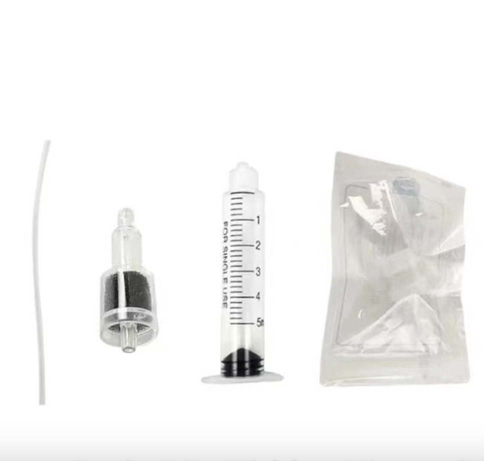 Набір для мезоінжектора негативного тиску складається з 4 предметів: стерильний картридж для ін’єкцій з 9 голками, фільтр, силіконова трубочка, дозатор у вигляді шприца