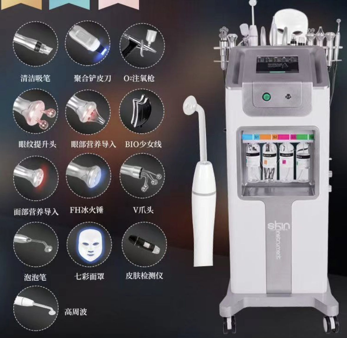 Сфера косметології постійно змінюється, прагнучи до інновацій для надання високої якості послуг з догляду за шкірою. Комбайн косметологічний для обличчя SKIN BZZ013 підійде для косметологічного кабінету або салону краси. Він оснащений 13 функціями, що дають змогу проводити основні процедури в області апаратної косметології на вищому рівні.