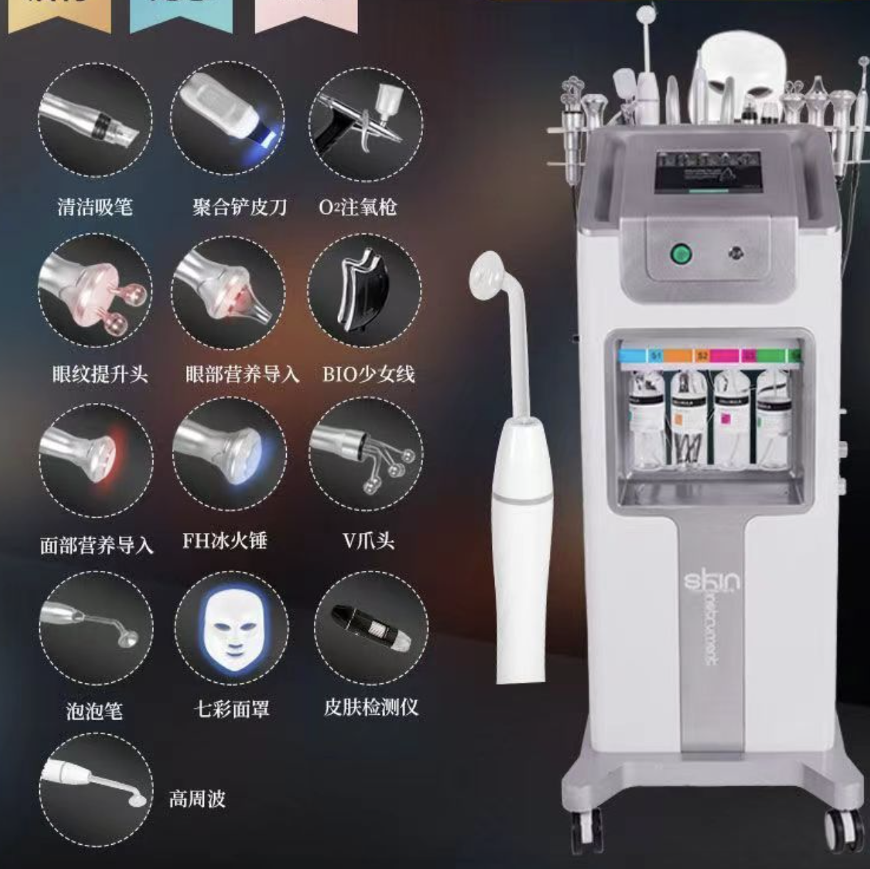 1. Гідродермабразія або аквапілінг. Пристрій доповнено 8 насадками. Гідродермабразія допомагає шкірі отримувати корисні мікроелементи, оновлюючи й омолоджуючи її.