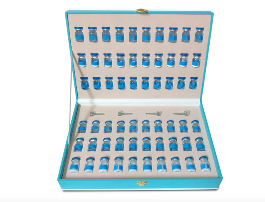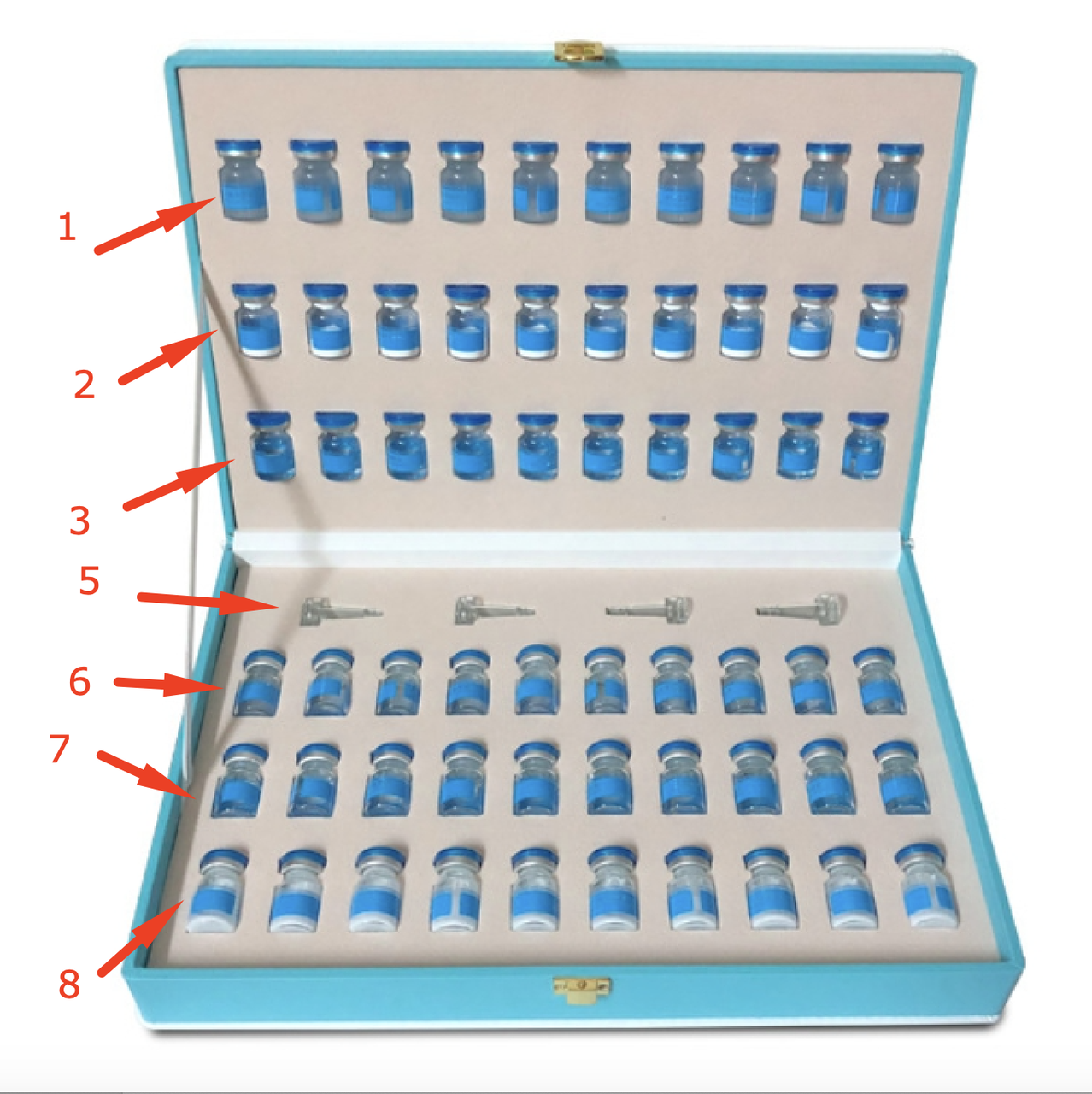 2. Змішати флакон з 2 ряду (кисневий порошок) з флаконом з 3 ряди (кисневої водної есенцією). Нанести до шкіру. Використовувати можна будь безін’єкціонний апарат для мезотерапії, наприклад ультразвук. Для косметологічних комбайнів рекомендується використовувати з апаратом кисневої мезотерапії (оксімезотерапии)
